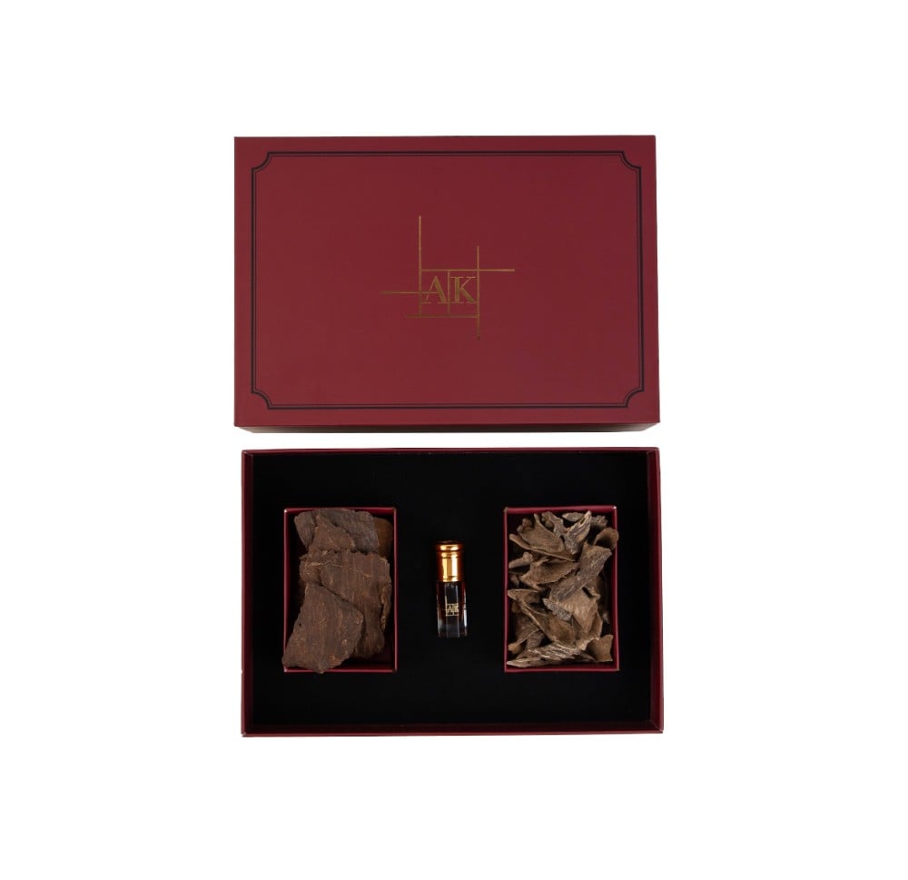 تحتوي المجموعة على ربع تولة من دهن الأرياني بنكهته البخورية الفاخرة، وأوقية من عود جار سوبر بنكهته العطرية الحادة، وأوقية فييتنامي سوبر عالي الغني بالدهن بمزيج نكهات زهورية وسويتية وبخورية