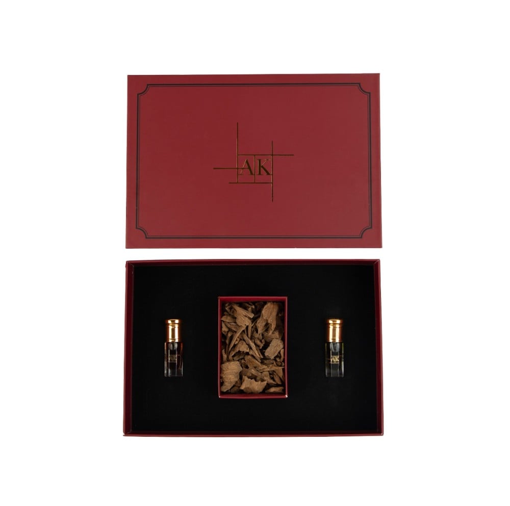تحتوي المجموعة على ربع تولة من دهن العود الهندي الفاخر بنكهة ترابية مميزة، ومخلّط الحرمين الصافي، وأوقية من عود دقة كلمنتان مالينو بثبات وفوحان مميزين